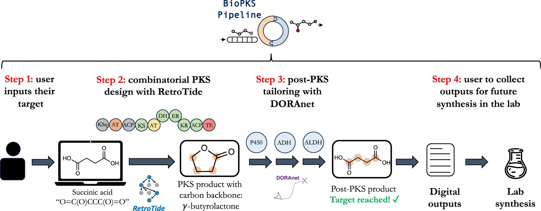 Here, we introduce BioPKS pipeline, an automated retrobiosynthesis tool combining multifunctional type I polyketide synthases (PKSs) and monofunctional enzymes via two complementary tools: RetroTide and DORAnet.